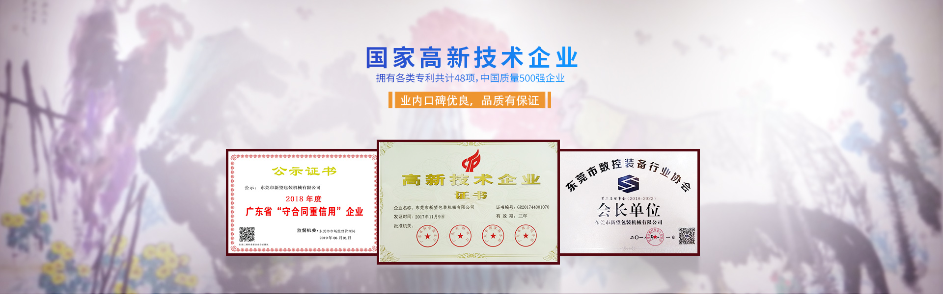 新望機(jī)械成立于1998年,位于東莞市東部工業(yè)園區(qū)的中心地帶——企石鎮(zhèn)東平村,交通方便、環(huán)境優(yōu)美舒適、視野開闊。公司注冊資本2000萬元,擁有辦公室、廠房等18,000多平方米。已通過ISO9001:2015國際質(zhì)量管理體系認(rèn)證,擁有國家各類專利共計(jì)58項(xiàng)。是東莞市企石鎮(zhèn)工商聯(lián)副會(huì)長單位、東莞市企石鎮(zhèn)文學(xué)藝術(shù)界聯(lián)合會(huì)副主席單位、東莞市環(huán)保包裝行業(yè)協(xié)會(huì)副會(huì)長單位、東莞市數(shù)控裝備行業(yè)協(xié)會(huì)第二屆會(huì)長單位、廣東省包裝技術(shù)協(xié)會(huì)常務(wù)理事單位、廣東省膠粘劑行業(yè)協(xié)會(huì)理事單位、廣東省著名商標(biāo)企業(yè)、國家高新技術(shù)企業(yè)。